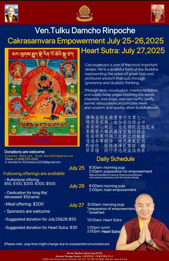 KTZL Toronto Thrangu Centre have the pleasure to invite you for Cakrasamvara Empowerment on July 25-26 and Heart Sutra on July 27 led by Tulku Damchö Rinpoche. May all beings benefit.